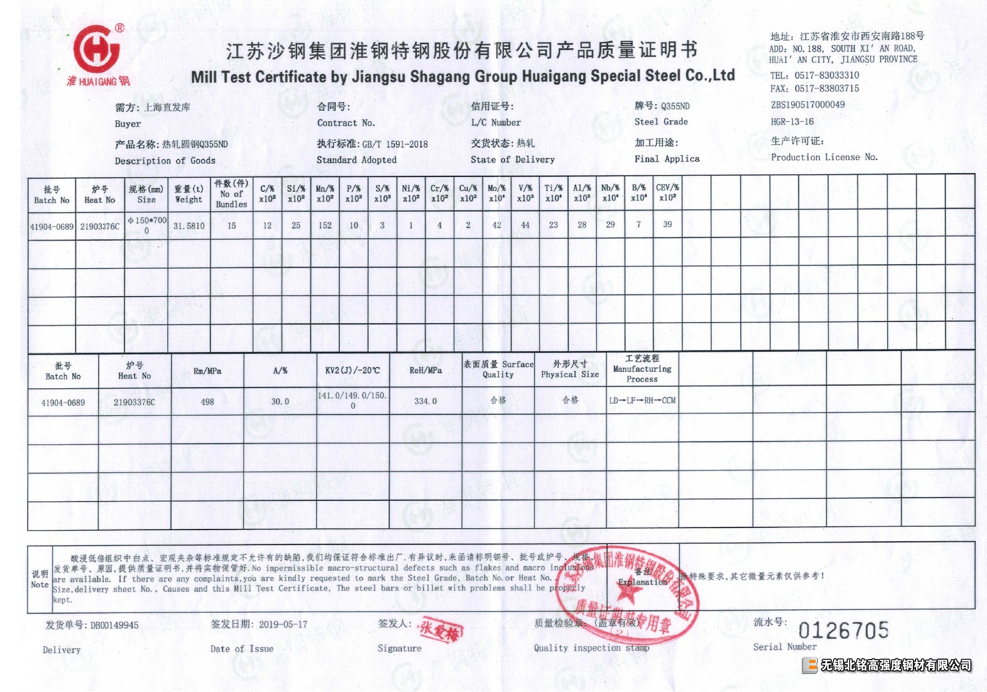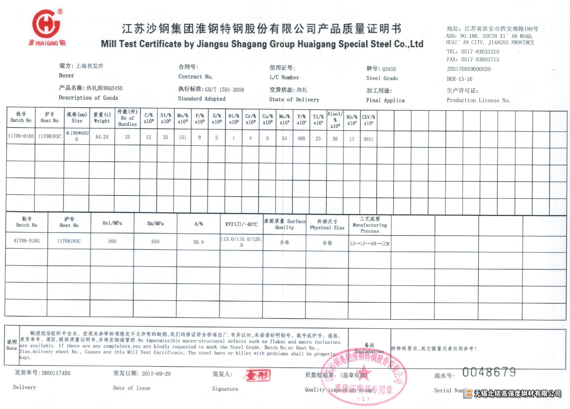 每支材料均有對應爐批號鋼廠質量證明書(質保書),保證-20℃、-40℃ 低溫沖擊功值合格。