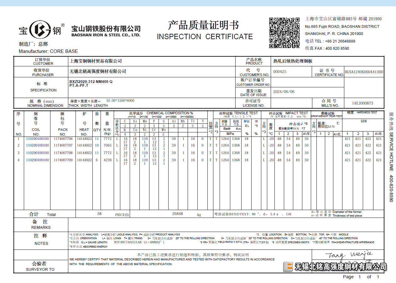寶鋼耐磨板不光有不錯的耐磨性能,在保證力學性能的同時,也可保證冷彎折彎性能。  這在國內耐磨板中非常少見。歡迎各位新老客戶前來咨詢!如有特殊規格尺寸可單獨定扎期貨。