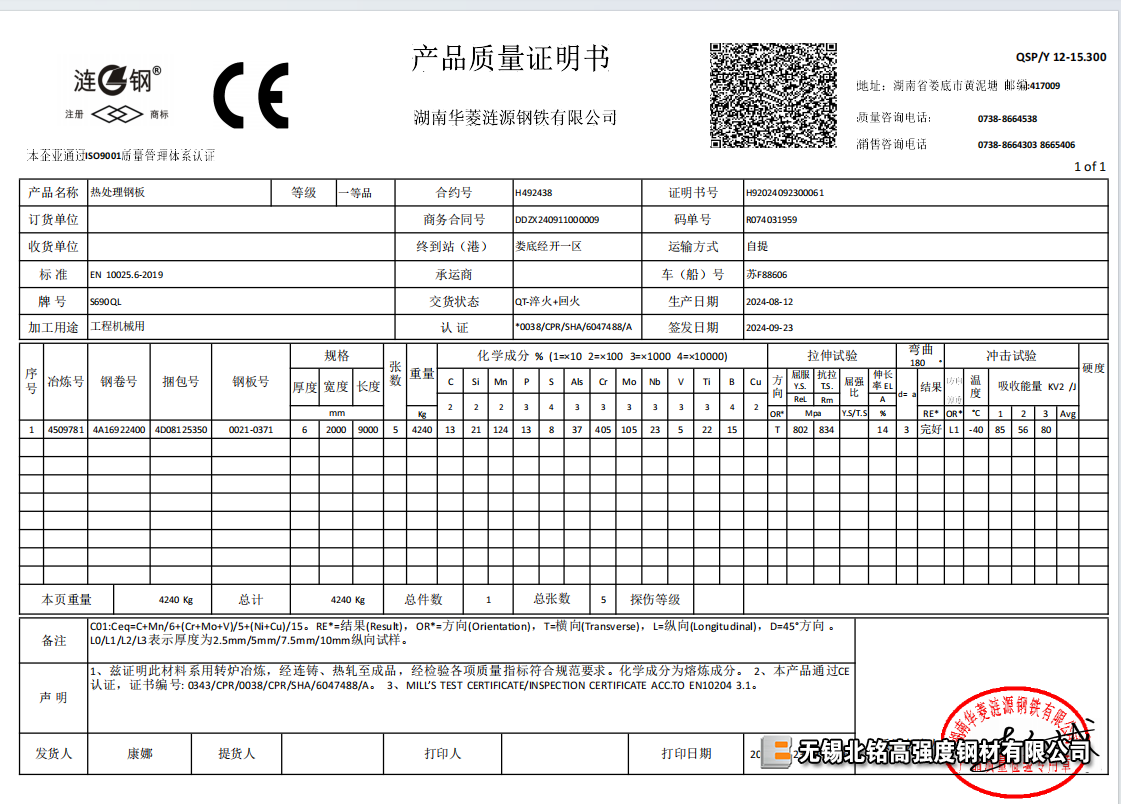 歐標(biāo)S690QL對應(yīng)國標(biāo)Q690E,該材質(zhì)耐低溫性能-40℃。屈服強(qiáng)度不低于690帕,抗拉不低于750帕。該批S690QL 6*2000*9000 為出口歐洲地區(qū)設(shè)備使用。執(zhí)行歐標(biāo)標(biāo)準(zhǔn)生產(chǎn)。質(zhì)保書帶CE認(rèn)證。